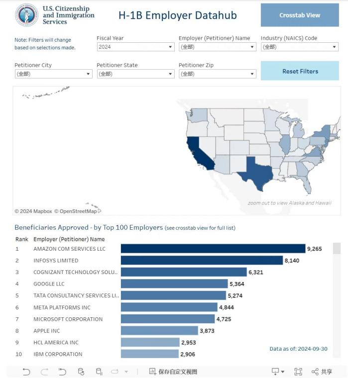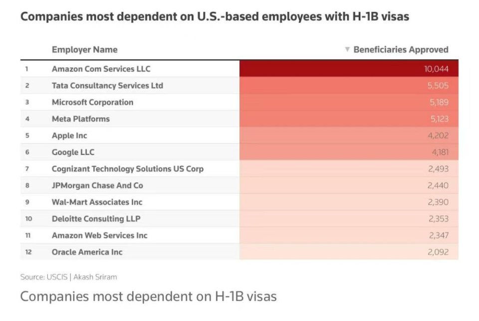 公开资料显示,美国H-1B签证申请者大部分来自科技公司,除对该签证需求极高的印度IT外包公司(如 TATA、INFOSYS)外,亚马逊、苹果公司的申请者也较多,且约71%为印度人。