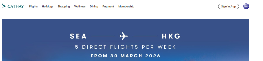 明年3月重新开通香港-西雅图航线,每周5班(周一、二、三、四、六执飞 A350-900)