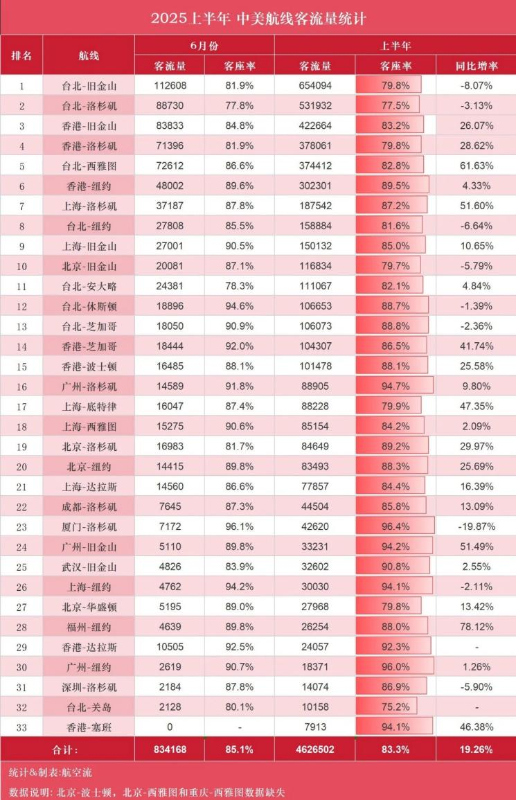 据航空流统计,今年上半年,中美客运航线客流同比增19.2%,平均客座率 83.3%,其中香港 - 美国航线客流量更是同比飙涨32.4%,高客座率与高增长印证了市场对优质中美航线的迫切需求。