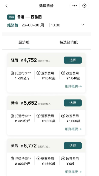从国泰航空小程序来看,目前该航线已开售,香港-西雅图单程经济舱4752元起。