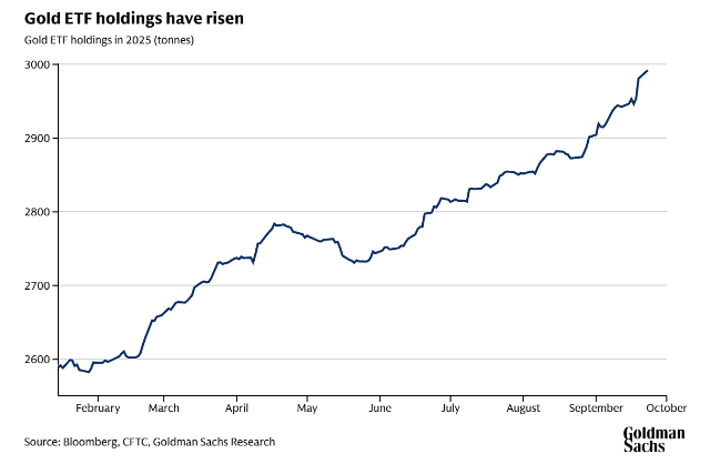 高盛研究部分析师Daan Struyven、Lina Thomas、Alexandra Paulus在最新发布的报告中表示,流入黄金ETF的资金意外强劲,超过了此前模型预测的水平。私人投资者大力投资黄金的可能性,给他们的预测带来了“巨大的上行风险”,即2026年中4000美元/盎司和明年年底4300美元/盎司。