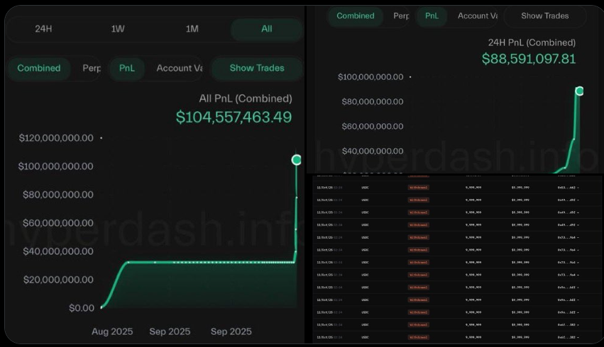 仅Hyperliquid这一个平台公开的链上数据,就证实了这位“先知”在短短一天内,攫取了超过1.9亿美元的利润。