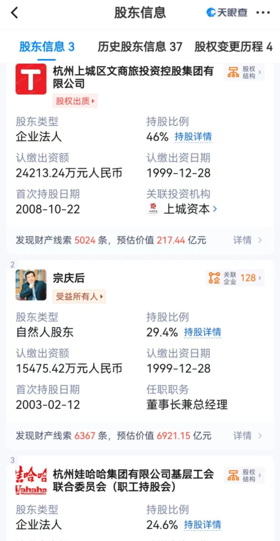 据天眼查显示,杭州上城区文商旅投资控股集团有限公司作为娃哈哈集团的最大股东,持股比例为46%,宗庆后为第二大股东,个人持有29.4%的股份,剩余的24.6%股份,由多年元老组成的职工持股会持有。