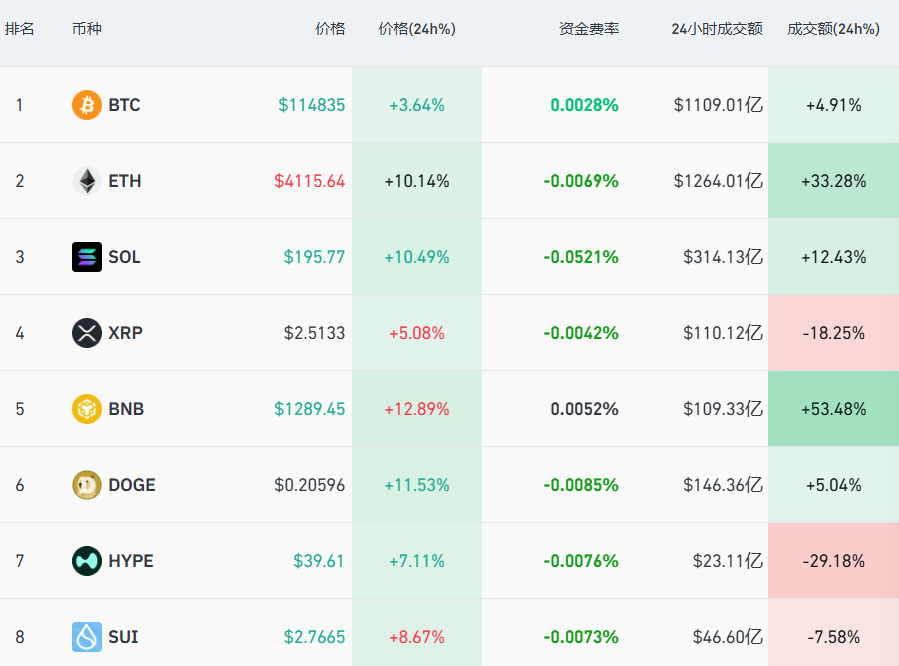 作为市场“风向标”的比特币,其反弹表现尤为亮眼。此前在黑天鹅事件中,比特币价格从12.2万美元的近期高位断崖式下跌,最低触及10.15万美元,单日最大跌幅超16%,创下去年以来的最大单日跌幅纪录。而在反弹行情中,比特币展现出强劲回升势头:10月12日午后价格企稳回升,晚间突破10.8万美元关口,随后持续攀升,截至13日7时15分,最新报价达114835美元/枚,较此次暴跌的最低点反弹超13%,距离12万美元高位仅差约6%。从交易数据看,比特币在反弹过程中成交量同步放大,13日凌晨时段的1小时成交量一度突破80亿美元,显示市场买盘意愿明显增强。