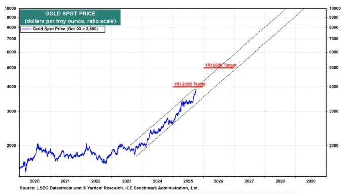 Yardeni表示,“我们目前的黄金目标是2026年达到5000美元。若维持当前涨势,2030年前或将突破1万美元大关。”