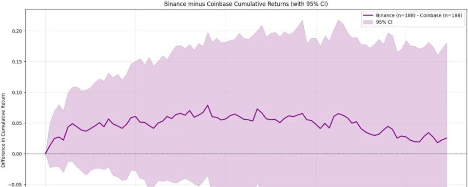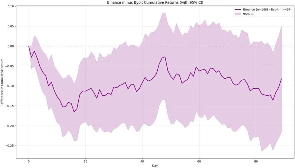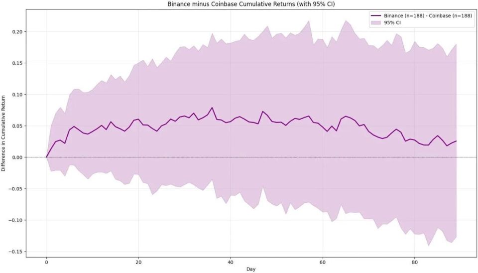 你可以清楚地看到——尤其是在 Coinbase 的例子中——币安的影响是正面的,而不是负面的。Coinbase上的抛售压力远大于币安。当然,一旦考虑到置信区间,这种差异在 95% 的置信水平上不具有统计学意义——但结论仍然相当明确:币安上币的表现优于 Coinbase 上币。