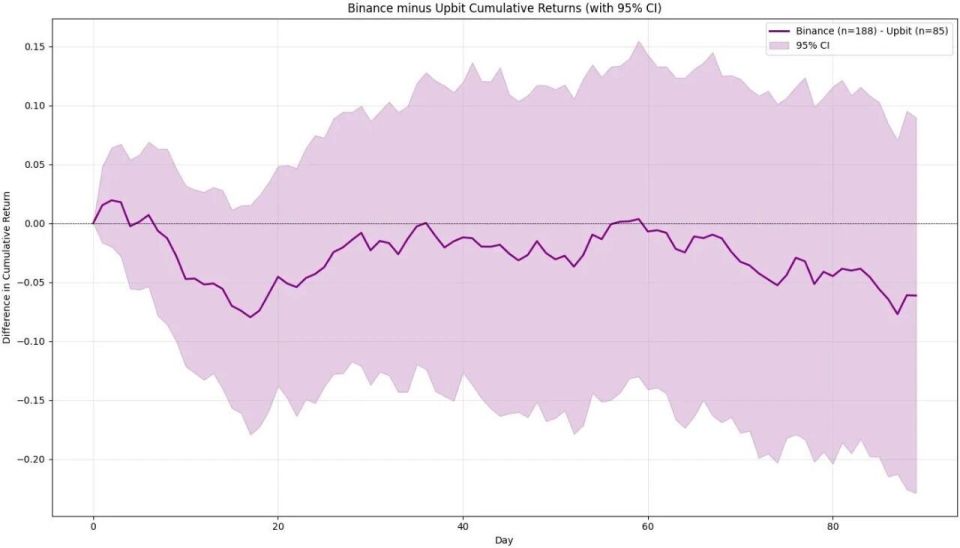 我们无法直接回答这个问题——目前没有清晰的数据。但你至少应该在心中有一个估算,思考一下其中的逻辑,然后给出一个数字。我之前提到过,Upbit也是一家“终极目标”交易所,人们喜欢在韩国上市。不幸的是,我们仍然看到上市日后强劲的抛售压力。对于项目来说,这几乎总是一个终局——可能不如币安那么严重,但仍然显著——你可以在数据中清楚地看到这一点。下图显示了Upbit 的表现以及币安和 Upbit 之间的差异。