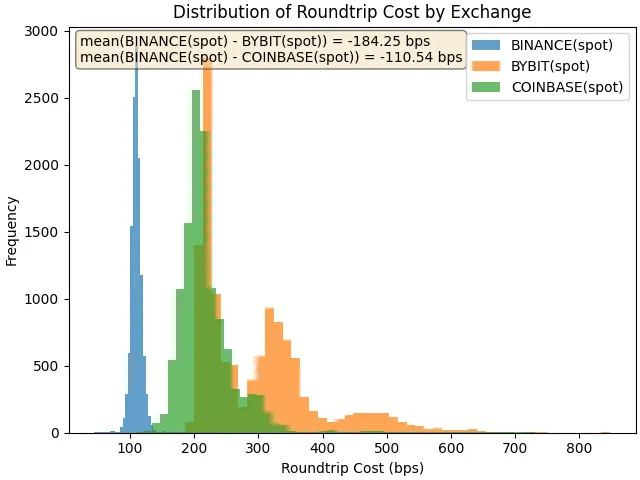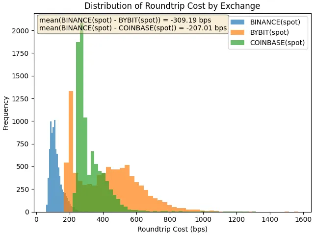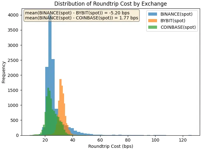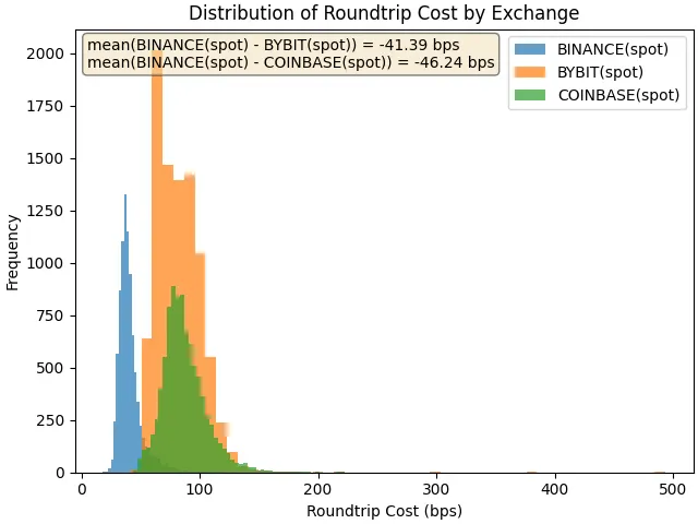 就ONDO而言,币安和 Coinbase 之间的往返成本大致相似 - Coinbase 略有优势(仅相差1.77个基点,可能是由于最小变动价位差异造成的)。