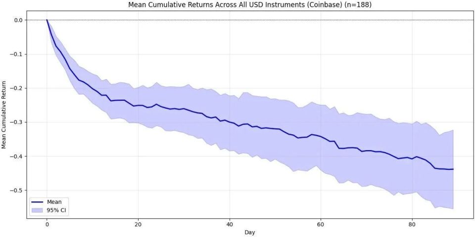 正如你所看到的,Coinbase的图表看起来比币安的要糟糕得多。上线约 20 天后,预期回报率降至约 -25%(而且上置信区间仍在-20%左右!)。此后,我们再次看到了同样的模式——短暂的稳定后是一个缓慢的下跌趋势,就像在币安上一样。
