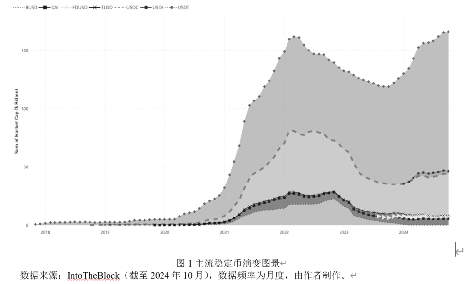 由于比特币、以太坊等原生加密货币存在波动性高、交易确认时间较长、手续费较高等问题,难以成为大规模采用的支付手段,因此其交易频率和范围在稳定币出现之前相对较窄,与法币流通域之间的交集更是非常有限。但是稳定币的出现与普及,特别是与法币挂钩的稳定币,改变了这一状况。一方面,稳定币的普及降低了加密货币的价格波动性,极大地促进了加密货币行业的发展和新流通域的扩展;另一方面,法币通过稳定币“上链”,其流通模式亦发生了重大变化,不再依赖传统银行体系,而是可以通过区块链网络更自由地流通。