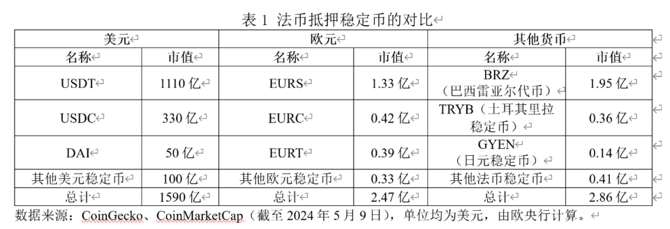 如图1所示。稳定币市场总值从2017年10月不到20亿美元的水平,快速增长到2024年10月接近1700亿美元的水平,尤其是随着美联储大幅降息以及加密货币市场的繁荣,稳定币的使用量与市场规模在2020年和2021年迎来爆发式增长。根据欧央行的统计,稳定币的交易量在2021年超过了其他加密货币,平均季度交易量达到2.96万亿欧元,十分接近纽约证券交易所的美国股票季度交易量(3.12万亿欧元)(Adachi et al.,2021)。从图1的数据来看,USDT作为第一大稳定币,长期占据了约三分之二的市场份额,其次是美元硬币(USDC)和DAI。相较于美元稳定币上千亿美元的市值体量,欧元及其他法币稳定币的市值总和还不到10亿美元,这与现行国际货币体系的储备货币份额形成了鲜明对比(表1)。