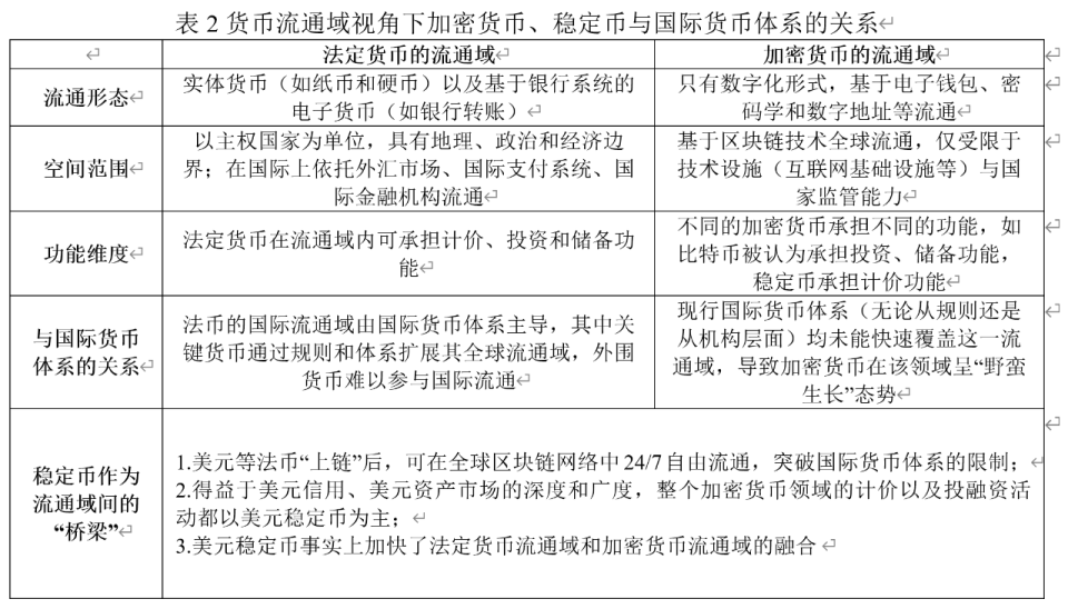 最后是中介角色的转变和消解。法定货币流通域需要金融机构作为支付、清算和交易的中介,而加密货币的流通域一方面在现实发展过程中,由大型交易所和稳定币发行商等新的中心化组织(所谓的“再中心化”)取代了原有的金融机构。另一方面则通过去中心化协议摆脱了中介机构的依赖,这也导致原有的规则、制度无法对新的流通域进行有效管理。为清晰呈现加密货币创造的新货币流通域与“法定货币流通域”的差异,特将二者在形态、范围、功能与国际货币体系的关系等关键维度在表2中进行对比。