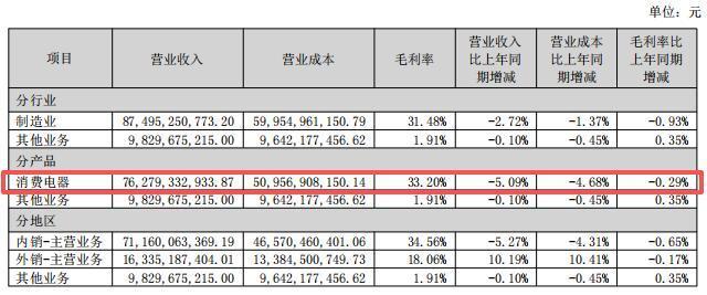 分产品来看,占营收比例最大、覆盖家用空调销售的消费电器业务增长乏力,该板块上半年营收762.8亿元,同比下滑5.09%,毛利率下降0.29%至33.20%。
