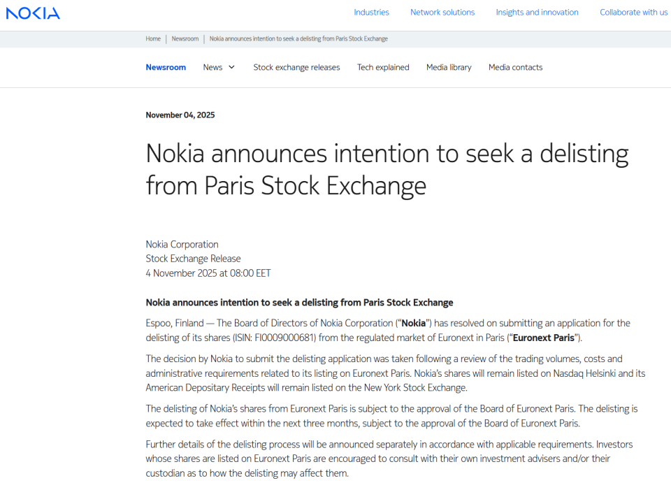 11月4日,诺基亚官网宣布,诺基亚公司董事会已决议提交申请,将其股票(ISIN:FI0009000681)从巴黎泛欧交易所的监管市场退市。