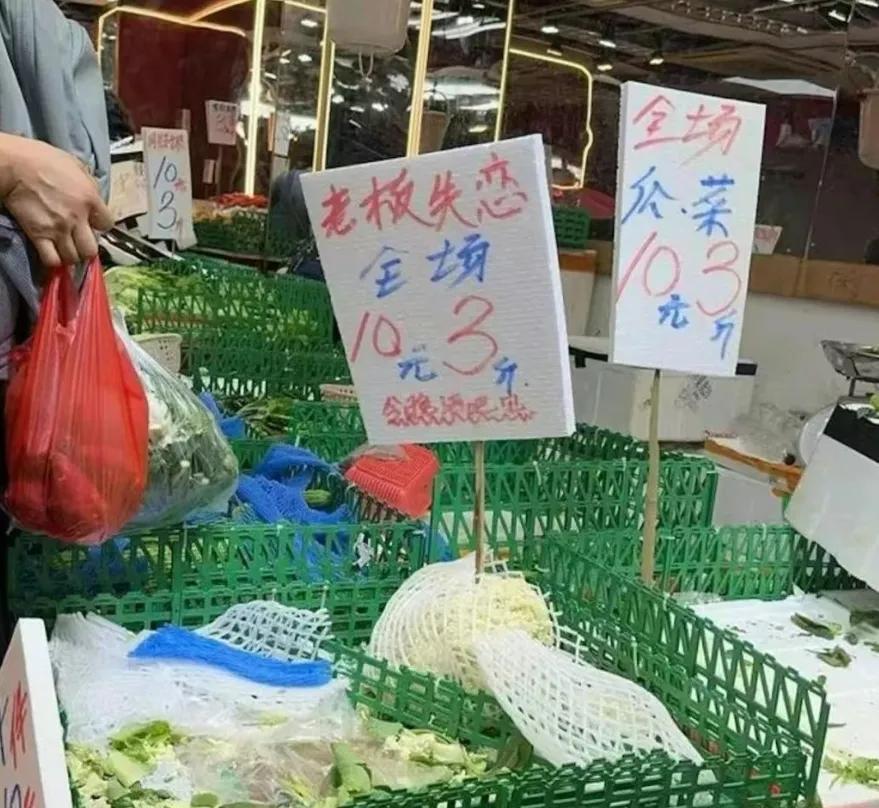 菜牌直接标明“同归于尽”。有老板甚至还会根据心情调整价格,比如"1元一条"的瓜类和"1元一斤"的青菜。如果恰巧碰到"老板失恋",全场蔬菜统统10元3斤。