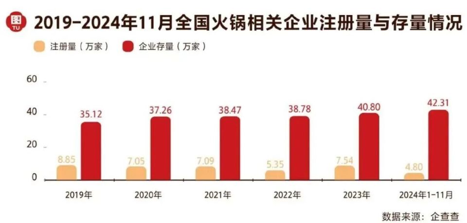 《2024火锅行业消费趋势报告》指出,截至2024年11月,全国火锅相关企业存量达到42.31万家,新开火锅门店数量达到4.8万家。
