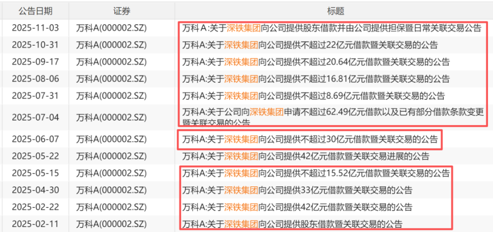 就在万科发布第三季度财报同日,集团发布公告,“深铁集团拟向公司提供不超过22亿元借款”。这已经是今年深铁向万科提供的第12次借款了,累计金额已达291.3亿元,超过了深铁一年半的营收。以至于有人调侃:“在深圳每坐一次地铁,都是在给万科续命。”