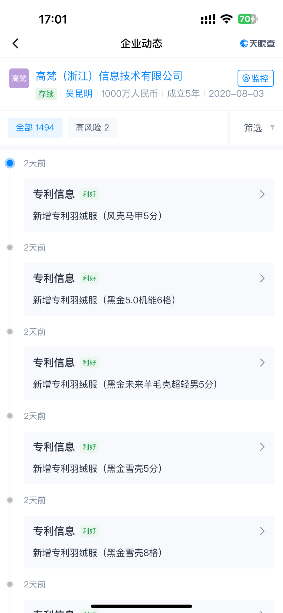 21世纪经济报道记者查询天眼查平台获悉,近期高梵连续公布了多项专利信息,多为轻户外场景。其官方称,推出的“机能”“风壳”等系列,均强调面料防风防水、耐磨、轻量等功能属性,精准匹配都市人群在多种轻度户外场景下的穿着需求。