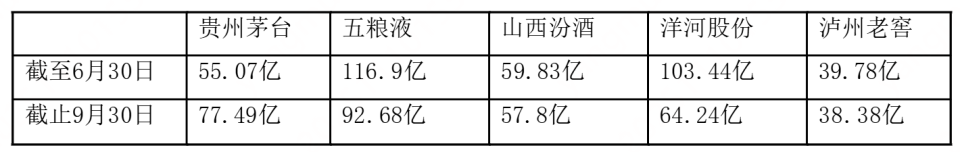 (今年第二季度、第三季度,各大酒企“合同负债”的变动。数据来源:酒企财报)