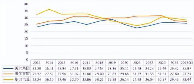 美的、海尔、格力近年来毛利率变化;数据来自Wind