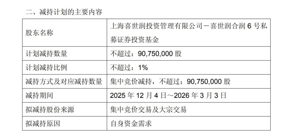公司持股5%以上股东、董事长张轩松及一致行动人“上海喜世润投资管理有限公司—喜世润合润6号私募证券投资基金”,因自身资金需求,拟减持最多9075万股股份,减持将在公告之日起十五个交易日后的三个月内以集中竞价交易方式进行,价格视市场情况确定。