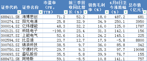 此外,从下表可以看出,阳光电源在一众储能公司中明显具有估值较低、收入增速较高的特点,到11月13日,公司市盈率约26倍,而前三季度收入增速达到33%,仅次于今年刚上市的科创板公司海博思创,后者收入增速更高,所以估值更高、涨幅更高。