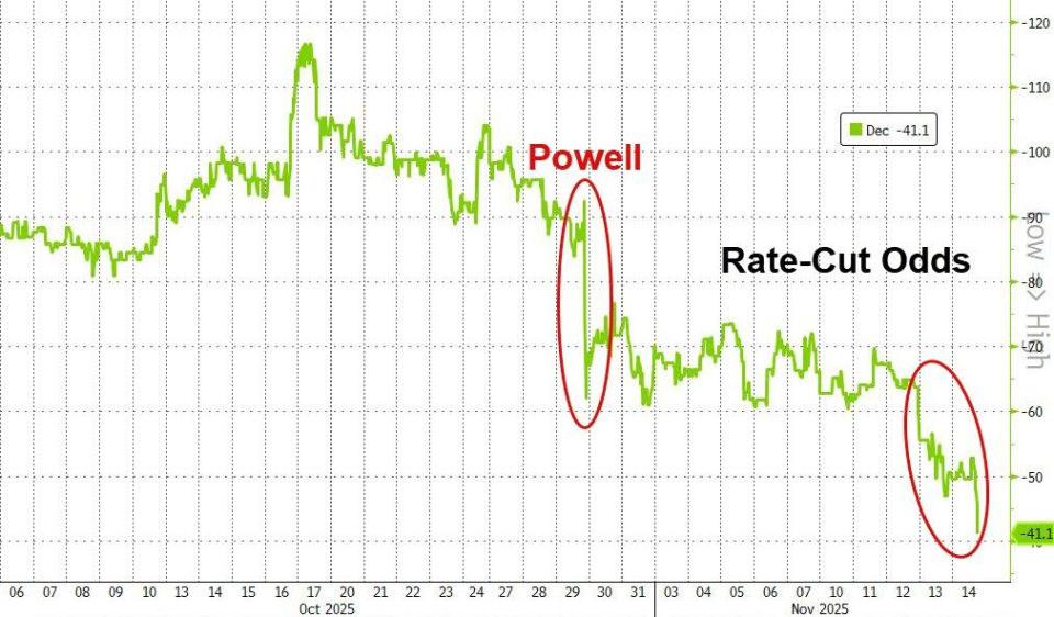 市场预期急转,交易员押注政策暂停。在美联储10月29日宣布降息后,尽管鲍威尔鹰派发言,但市场依旧连续数周看好12月会继续降息。然而截至周五,降息概率已跌至4成。