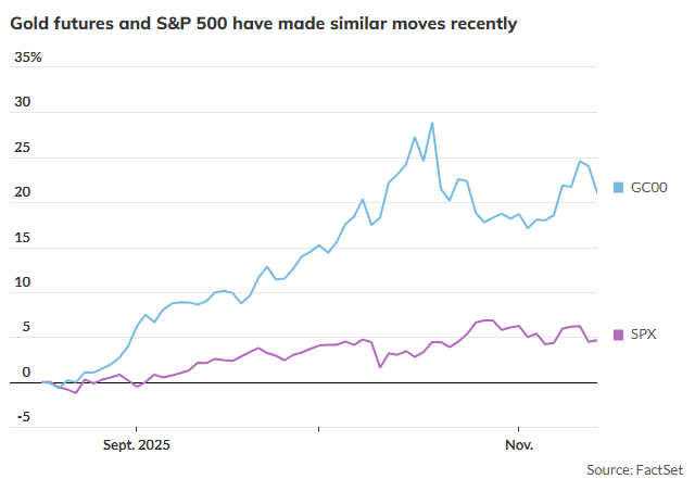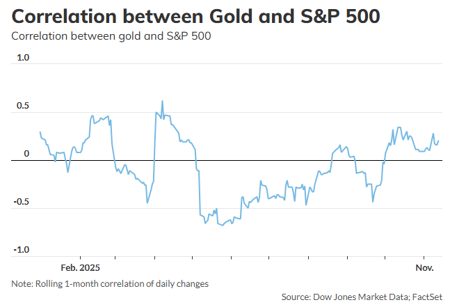 道琼斯市场数据对FactSet数据的分析显示,截至上周五,COMEX最活跃的黄金期货与标普500指数的21天滚动相关系数为0.22,略呈正相关。在今年10月和11月至今,该相关系数大多数时段内维持着温和的正相关状态。