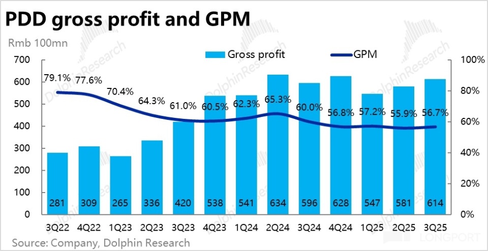 本季拼多多毛利润为 581 亿,同比增长 3%,和彭博一致预期基本一致。其中,因收入结构中 Temu 业务占比的走高,毛利率同比角度仍然下降了 3.3%,但跌幅明显收窄。背后原因,应当是 Temu 收入和占集团总营收比重提升速度的减缓,以及 Temu 中毛利率更高的半托管的比重的上升。