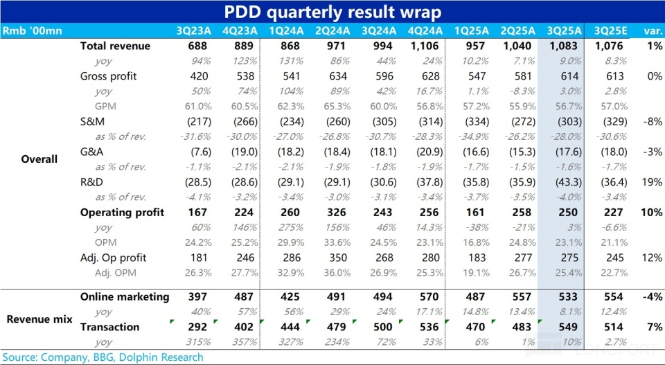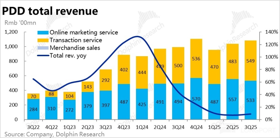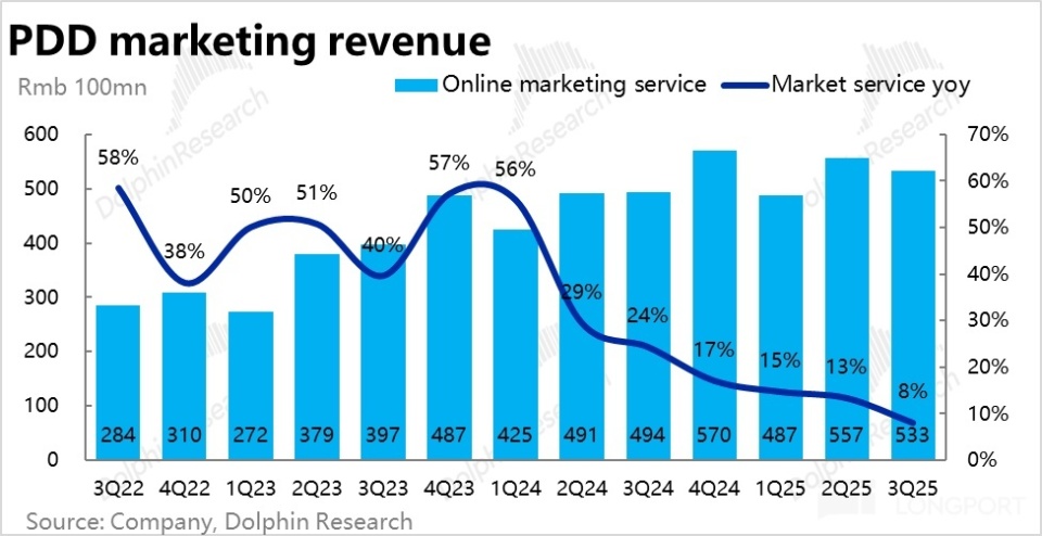 本季度拼多多总营收约 1083 亿人民币,同比增长 9%,略微高于市场预期。趋势上看似相比上季的增长有所加速,但结构上更关键的广告收入增速实际是明显放缓到仅个位数的 8%(历史首次)。