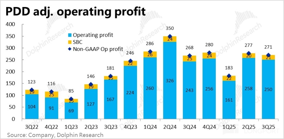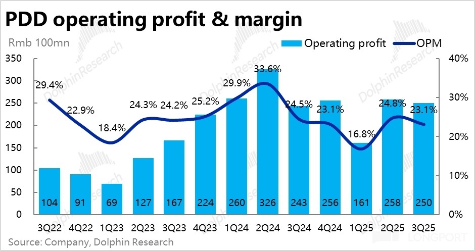 具体来看,仍是营销费用支出比预期要少,实际支出 303 亿比预期少了约 26 亿,同比不涨反降了 0.5%。海豚君认为,主要原因应当是国补退坡后,先前拼多多需要自行出资补贴的这部分投入明显降低的影响。此外,从 Temu 的增长看起来也没有乐观预期那么强,其费用投入再加大的幅度或许也没预期的那么高。