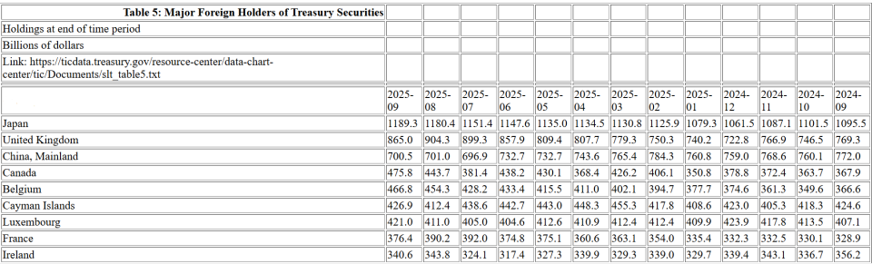 数据显示,9月份美国以外的国家和地区整体持有的美国国债规模为9.25万亿美元,略低于8月份修正后的9.26万亿美元。报告同时指出,美国国债持有量不仅受交易活动影响,也受估值变动因素作用,彭博美国国债指数在8月和9月均录得上涨。