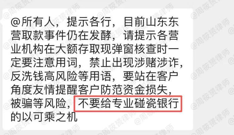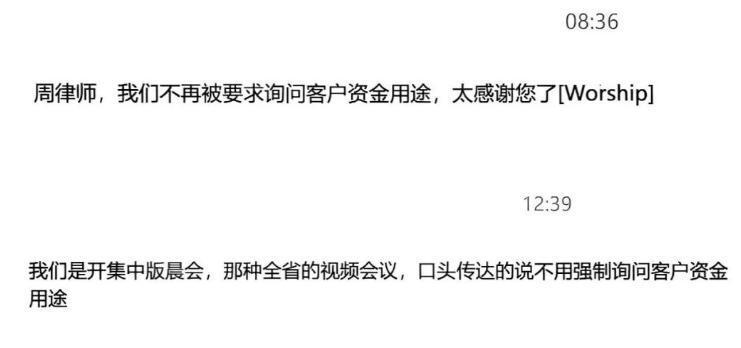 周筱赟说,还有中部某省行柜员反馈,称已开会通知,取消询问客户资金用途,但只是口头通知,未下发文件。