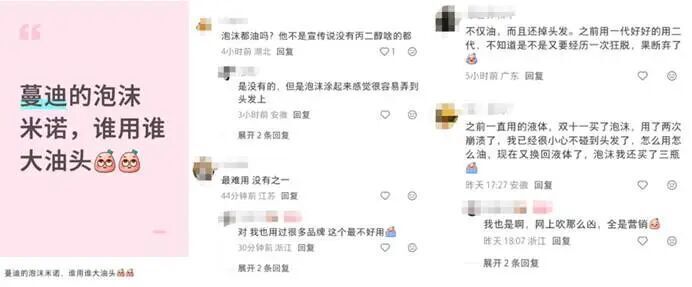 “蔓迪的泡沫米诺,谁用谁大油头”、“不仅油,而且还掉头发。之前用一代好好的用二代,不知道是不是又要经历一次狂脱,果断弃了”……
