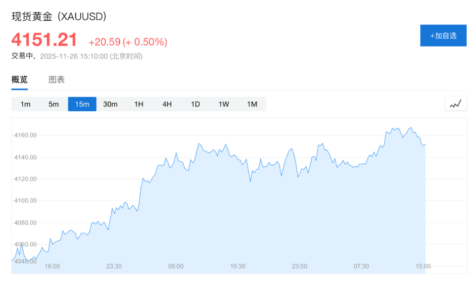 受降息预期与俄乌局势不确定性推升的避险需求共同提振,现货黄金日内上涨0.5%,报4151.21美元/盎司。