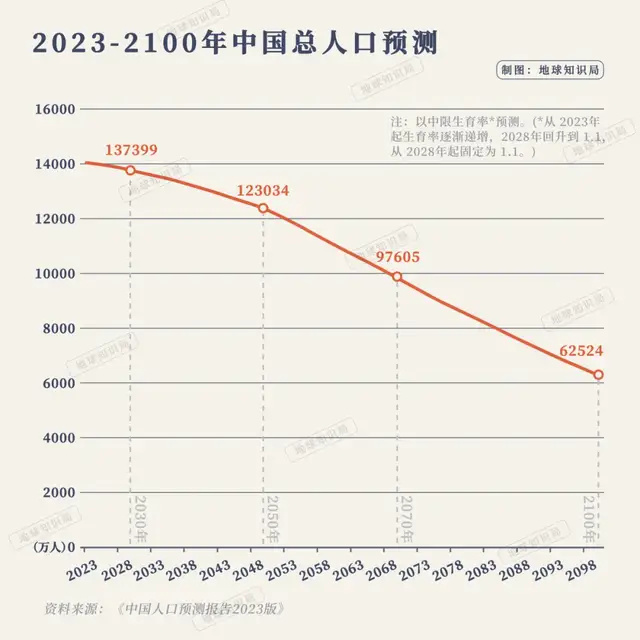 《中国人口预测报告2023版》的人口预测值得参考,根据这份报告的预测,若保持现在的生育率不变,到2030年中国人口将降为13.74亿,到2050年中国人口将降为12.30亿。