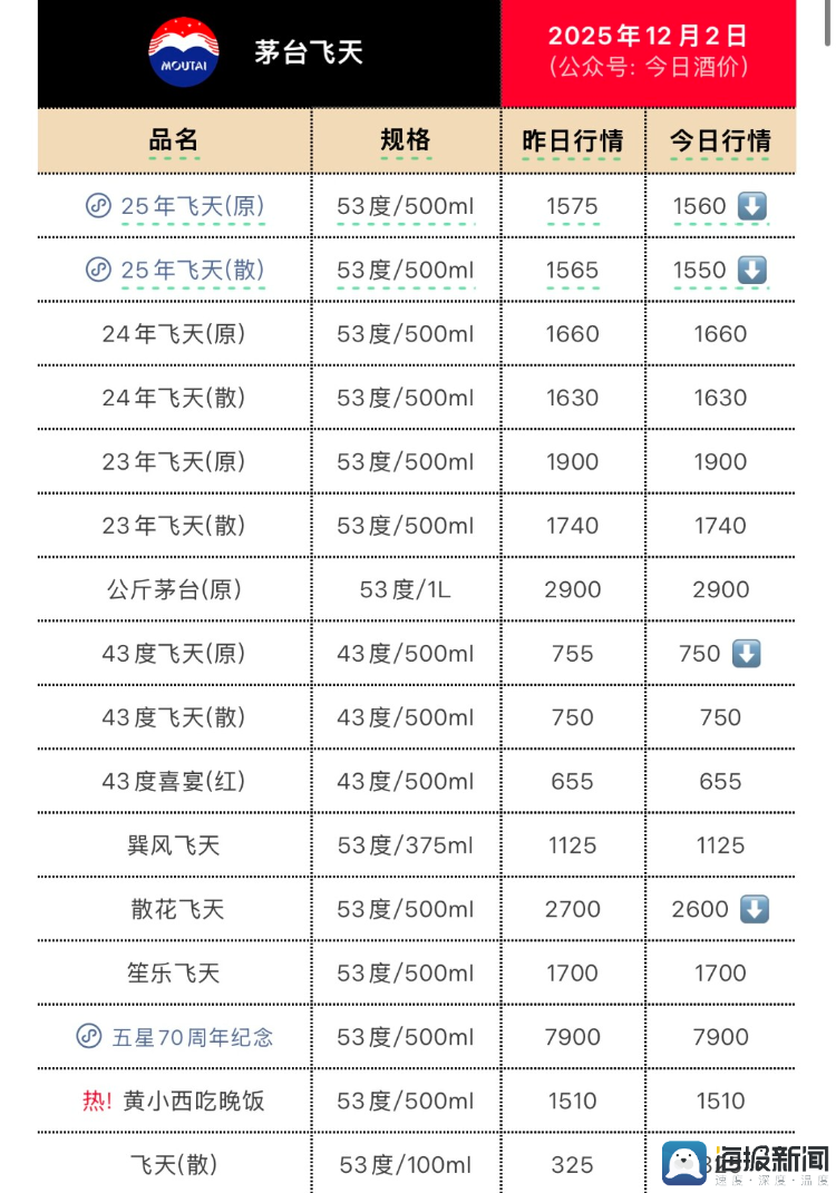 批发端,自11月27日批发价跌破1600元/瓶后,飞天茅台的批发价格持续下跌。据“今日酒价”报价,12月2日,飞天茅台53度500ml原箱批发价较前日下降15元/瓶,报1560元/瓶;散瓶同样较前日下跌15元,报1550元/瓶。
