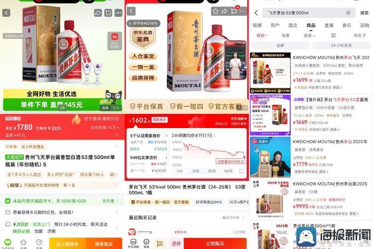 当日,其他电商平台的飞天茅台价格在1700元/瓶上下,从左至右依次是淘宝天猫平台、京东平台、抖音平台。