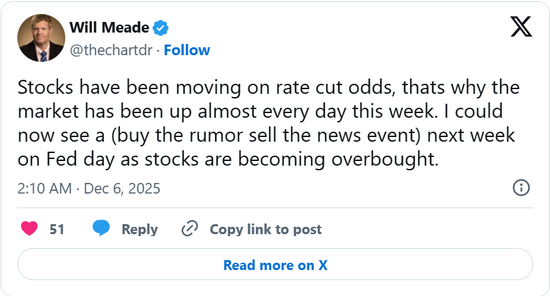 eToro美国投资分析师布雷特.肯韦尔(Bret Kenwell)也表示,“我认为关键在于美联储对2026年经济和政策前景的预测,这将决定市场月底能否迎来‘圣诞老人行情’。我们将能清晰了解美联储的立场及其对明年的预期,这将定下市场基调。”
