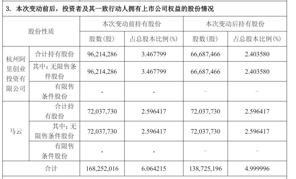 此次减持前,阿里创投持股为3.467799%,阿里创始人马云持股为2.596417%,一共持股为6.064215%;