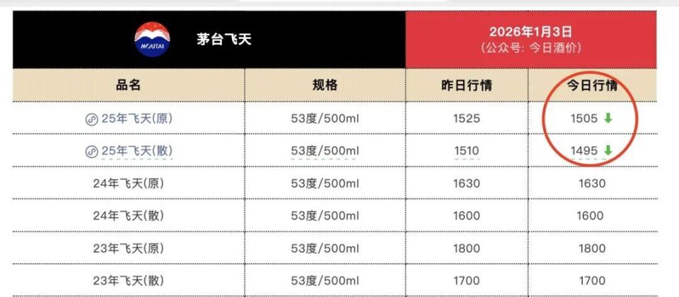 据第三方平台披露的批发参考价,2026年1月3日,2025年53度/500ml的飞天茅台原箱最新行情价为1505元/瓶,2025年飞天茅台散瓶行情价则为1495元/瓶,均较2025年12月31日下跌60元/瓶。