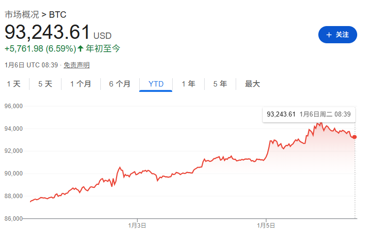 截至发稿,比特币价格约为93300美元,今年迄今涨幅为6.65%。以太坊价格也小幅上涨,目前在3200美元上方。与此同时,黄金和白银等贵金属受到委内瑞拉相关地缘政治扰动而走高,股票市场则继续受益于科技热潮。