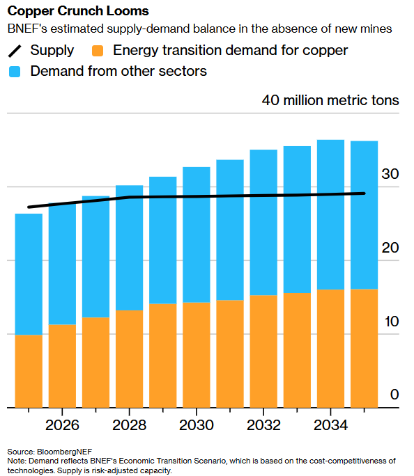 但由于现有矿山矿石品位下降,新项目又面临许可、融资和建设等障碍,预计全球铜产量将在2030年左右达到约3300万吨的峰值。