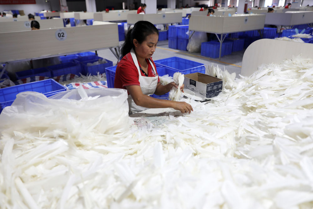 在滕焕杰的工厂里,工人们将分拣好的鸭毛挑到机器处打包,下一步是放入分绒机加工