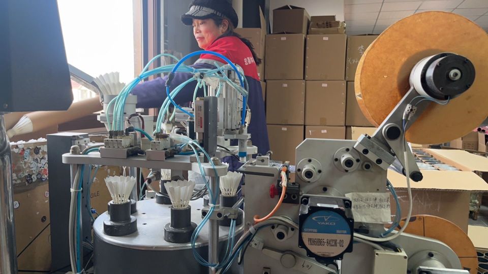 据金俊文观察,这几年羽毛球毛片的生产量“几乎翻了一倍”。安徽六安一家毛片自动化加工设备制造厂的技术人员也提到,他负责的机器主要销往无为,2023年和2024年销量非常可观,“机器只要生产出来,立刻就有人要。”