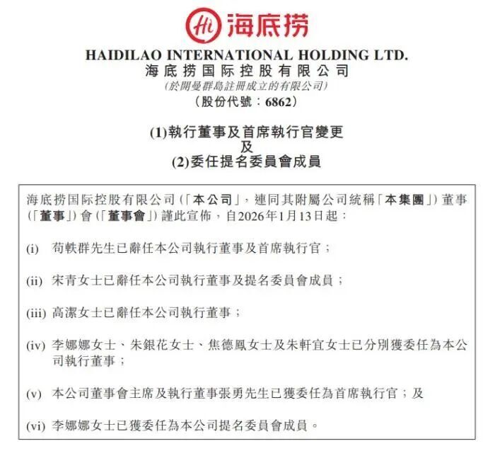 1月13日,海底捞发布公告称,自2026年1月13日起苟轶群已辞任公司执行董事及首席执行官,董事会主席兼执行董事张勇已获委任为公司首席执行官,自2026年1月13日起生效。
