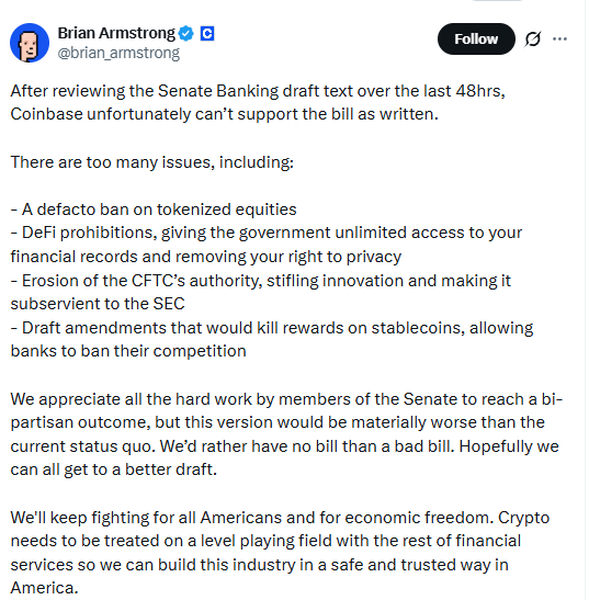 就在参议院银行委员会定于周四上午对法案进行审议前夜,美国最大加密货币交易所Coinbase首席执行官Brian Armstrong突然在社交媒体上宣布撤回对该法案的支持。Armstrong表示,“我们宁愿没有法案,也不要一个糟糕的法案”,并列举了包括限制稳定币奖励、代币化股票和去中心化金融等多项关键问题。