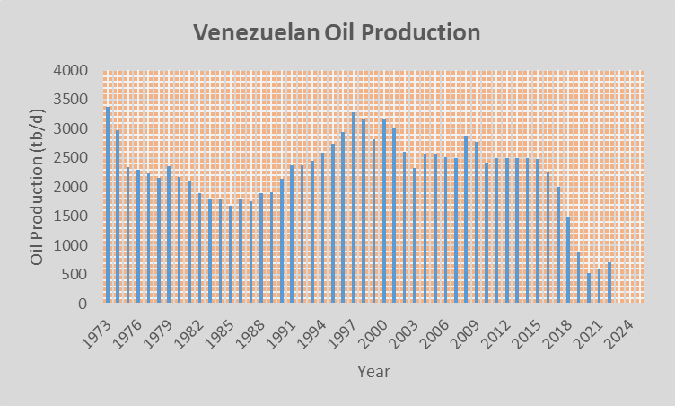 国有化进程在强化政治象征意义的同时,并未有效提升石油产业的专业效率与管理能力,PDVSA逐渐从一家商业化企业转变为政策工具,据国际能源署数据,委内瑞拉原油日产量从20世纪末的350万桶高峰,暴跌至2025年的约100万桶,产能利用率不足三分之一。