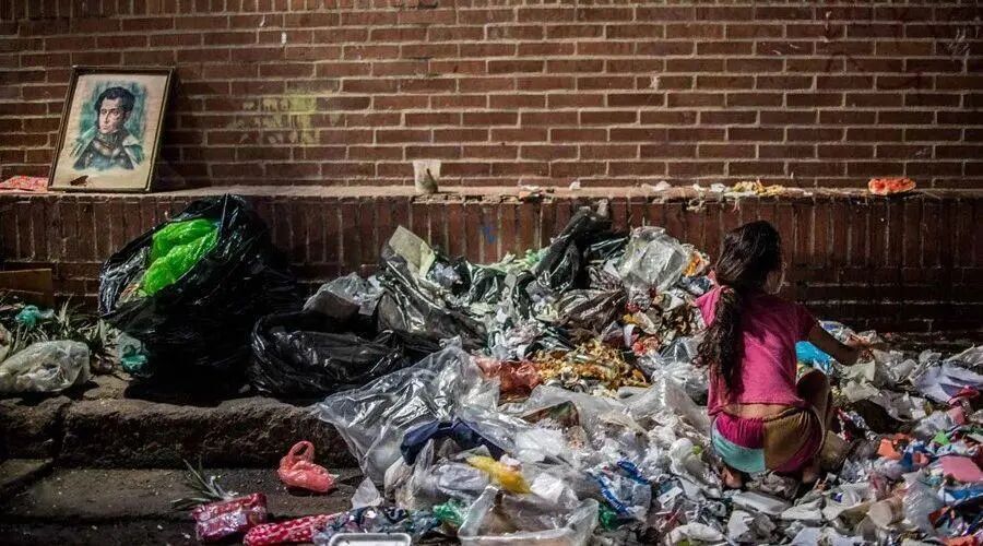 〓玻利瓦尔画像与捡食垃圾的小女孩同框