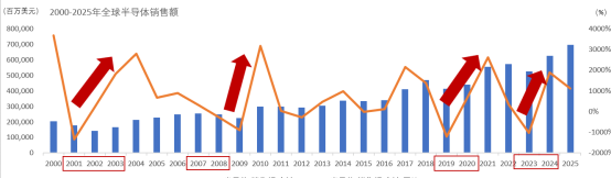 从当前数据来看,半导体行业正处于景气上行通道。根据世界半导体贸易统计组织(WSTS)2025年12月发布的报告,全球半导体销售额自2025年第二季度起持续回暖,已连续多月环比增长;2025年第四季度同比增速显著回升,预计超过20%,其中存储芯片因AI需求爆发和价格大幅上涨,成为本轮复苏的主要驱动力。